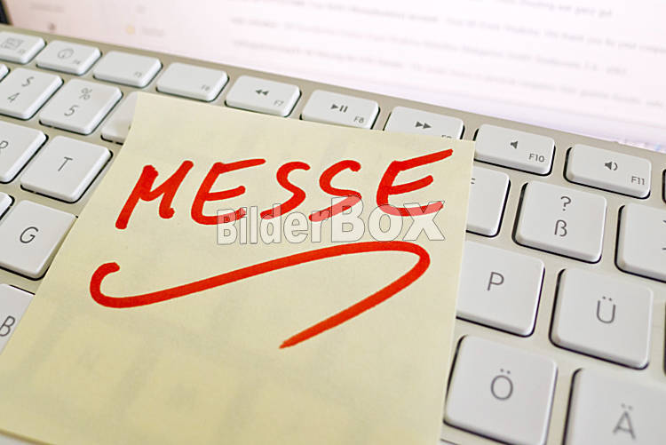 Beschreibung Ein Notizzettel liegt auf der Tastatur eines Computers zur Erinnerung: Messe