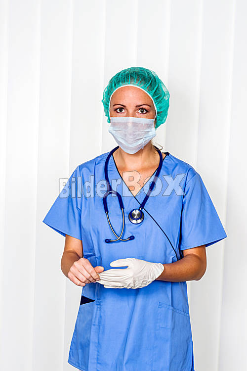 Beschreibung Eine Krankenschwester oder Ärztin in OP Kleidung vor einer Operation. Symbolfoto für arbeiten im Krankenhaus.