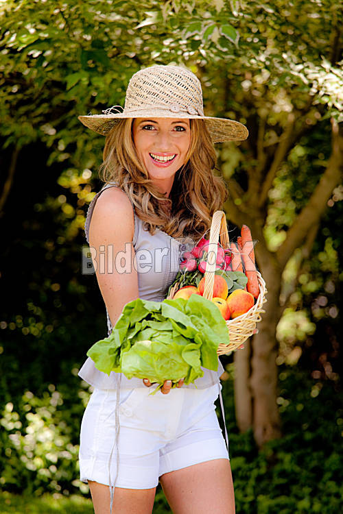 Beschreibung Obst und Gemüse im Korb mit Frau