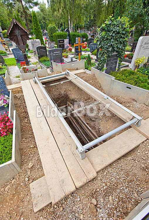 Beschreibung Leeres und offenes Grab auf einem Friedhof