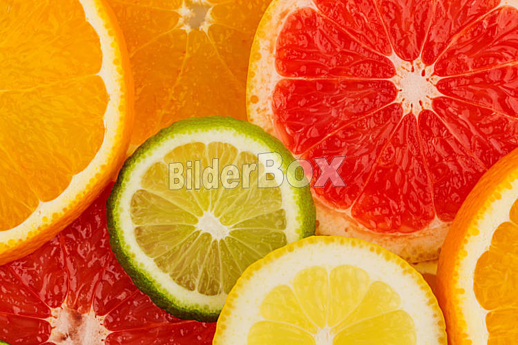 Beschreibung Scheiben einer Orange. Symbolfoto für gesunde Vitamine durch frisches Obst