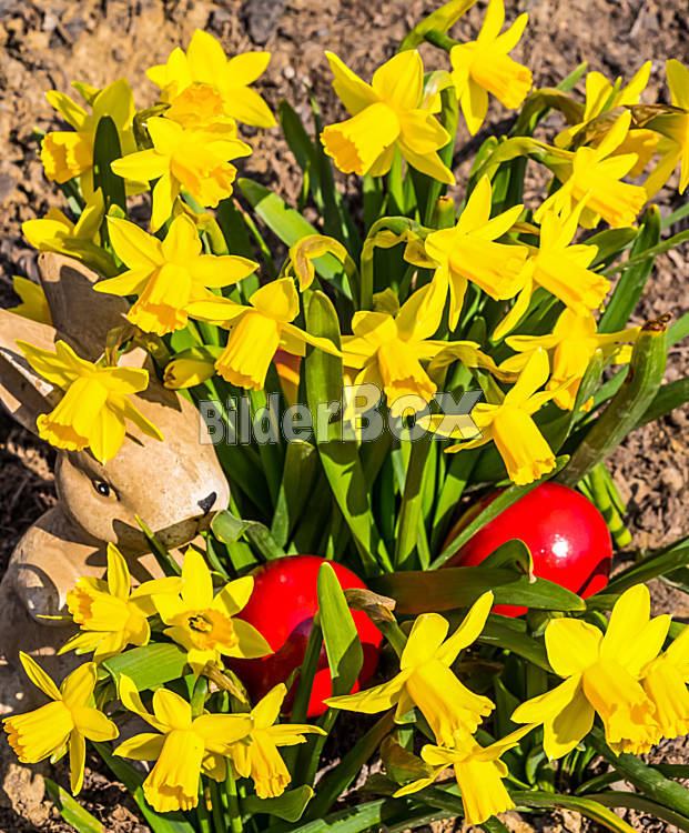 Beschreibung In einem Garten wurde ein Osternest mit Ostereier und Osterhasen versteckt. Brauchtum zu Ostern