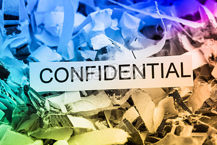 Beschreibung Papierschnitzel mit dem Stichwort Confidential, Symbolfoto für Datenvernichtung, Bankgeheimnis und Vertraulichkeit