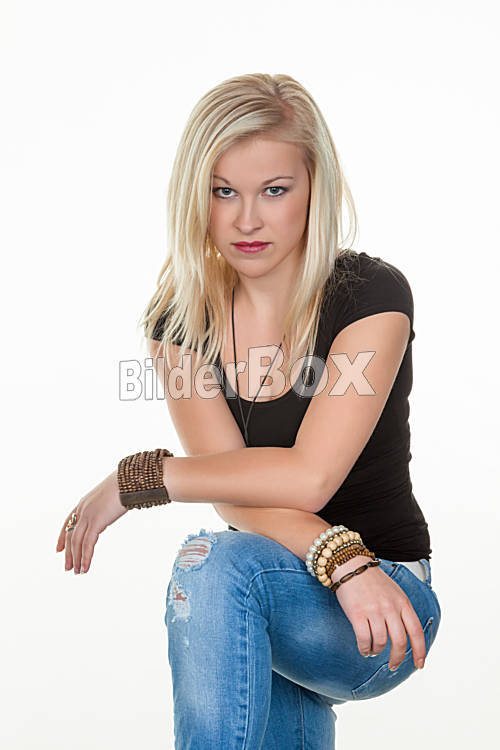 Beschreibung Porträt einer jungen Frau mit langen blonden Haaren im Studio.