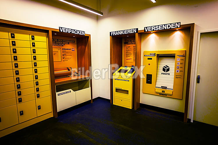 Beschreibung Eine Zone zu Selbstbedienung in einem österreichischen Postamt. Postfächer und Paketautomat