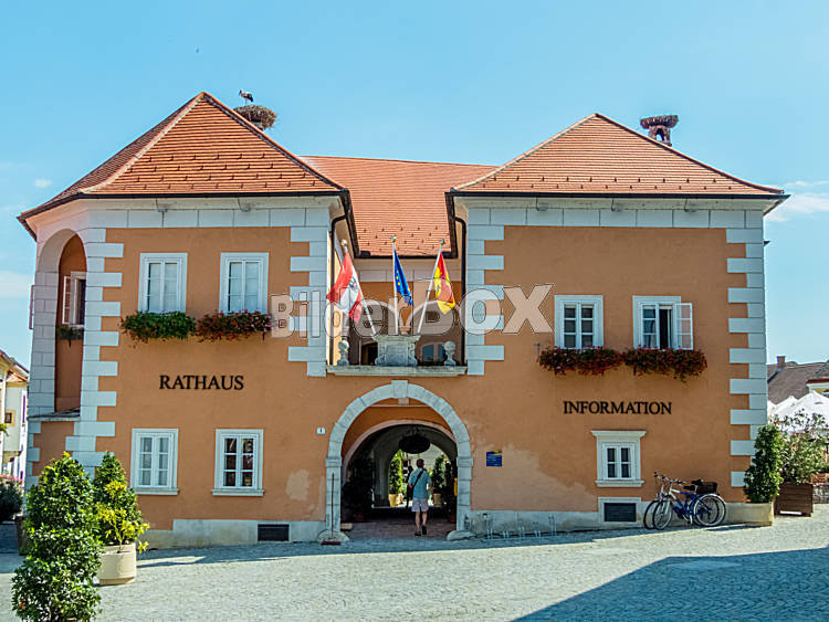 Beschreibung Ein Rathaus in Österreich mit der österreichischen Flagge