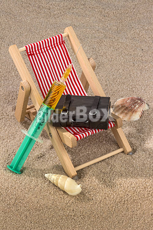 Beschreibung Symbolfoto Reiseapotheke Impfungen für Fernreisen. Tabletten auf einem Liegestuhl.