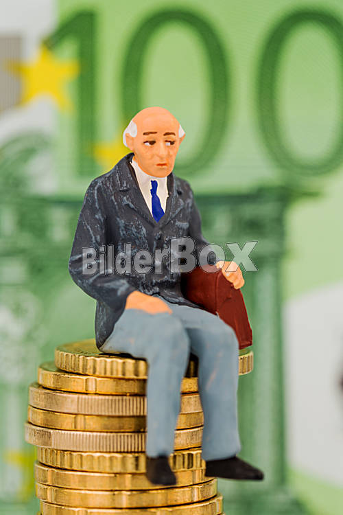 Rentner sitzt auf Geldstapel