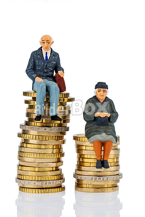 Beschreibung Rentner und Rentnerin sitzen auf Geldstapel, Symbolfoto für Altersvorsorge und Ungleichheit,
