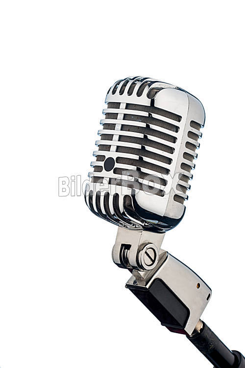 Beschreibung Ein altes Retromikrofon vor weißem Hintergrund.