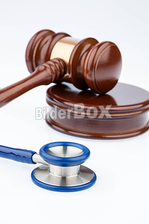 Beschreibung Richterhammer und Stethoskop, Symbolfoto für Pfusch und Ärztefehler