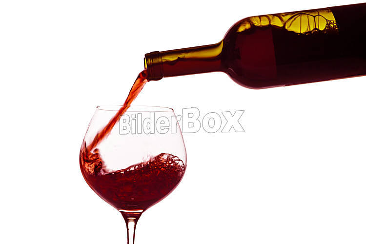 Beschreibung In ein Glas wird schwungvoll roter Wein eingeleert. Rotwein im Rotweinglas