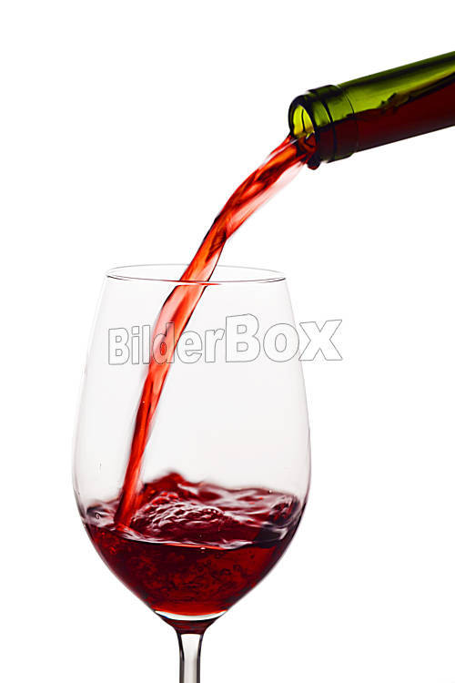 Beschreibung In ein Glas wird schwungvoll roter Wein eingeleert. Rotwein im Rotweinglas