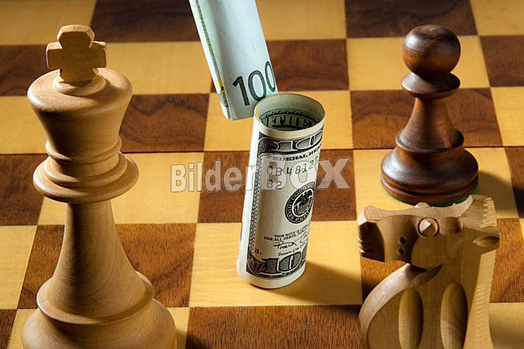 Beschreibung Schach mit Dollar und Euro Geldschein. Symbol für Abwertung des Dollars gegen Euro.