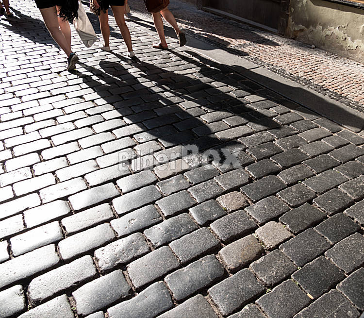 Beschreibung Schatten von Menschen auf einem Straßenpflaster