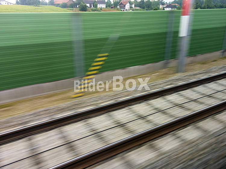Beschreibung Gleise und Schienen in Bewegung aus einem fahrenden Zug heraus. Symbolfoto für Zugfahrt, Tempo und Dynamik.