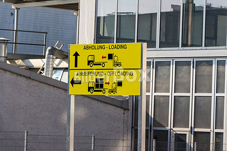 Beschreibung Ein Schild zeigt die unterschiedlichen Tore für Abholung und Anlieferung von Gütern mit LKWs an