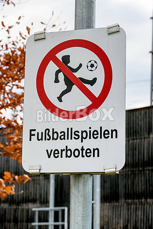 Beschreibung Schild Fußballspielen verboten, Symbol für Verbot, Kinderfeindlichkeit, Ordnung