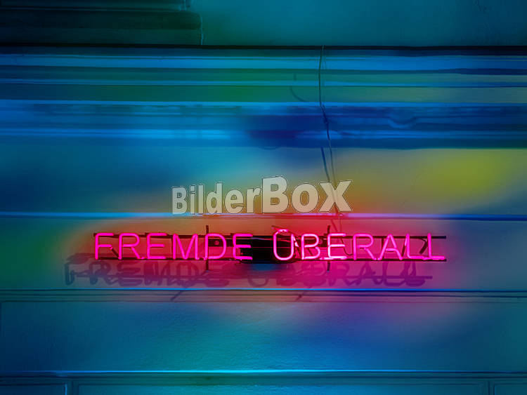 Beschreibung Schriftzug "Fremde überall" auf dem Museum der jüdischen Gemeinde in Wien. Bild farblich bearbeitet.