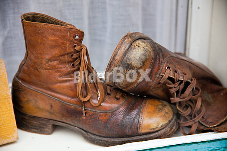 Beschreibung Alte, gebrauchte Schuhe liegen in einem Schaufenster eines Geschäftes