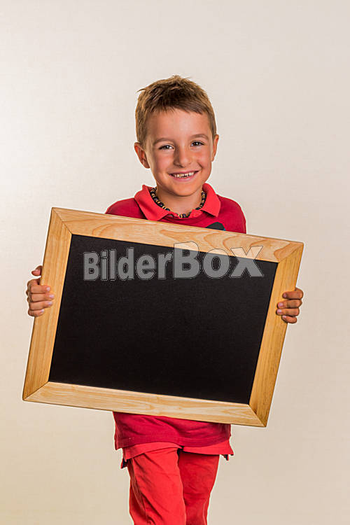 Beschreibung Ein Kind mit einer leeren Schultafel.