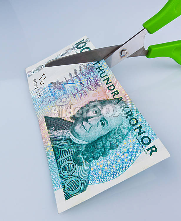 Beschreibung Schwedische Kronen, die Währung Schwedens. Mit schere. Abgaben und Steuern.