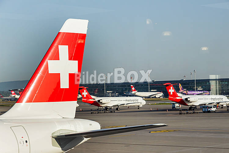 Beschreibung Schweiz, Zürich: Flugzeuge der Swiss auf dem Flughafen Kloten