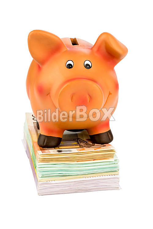 Beschreibung Ein Sparschwein steht auf Banknoten, Symbolfoto für Sparsamkeit, Rentabilität, Rendite