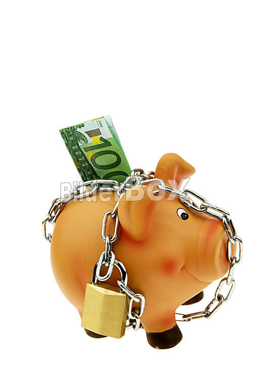 Beschreibung Ein fröhliches Sparschwein mit Kette und Schloß gesichert. Sicherheit beim Sparen.