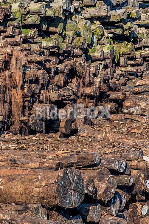 Beschreibung Stapel Holz mit Moos bewachsen, Symbol für Baustoff, Brennstoff, Vergänglichkeit, Tod