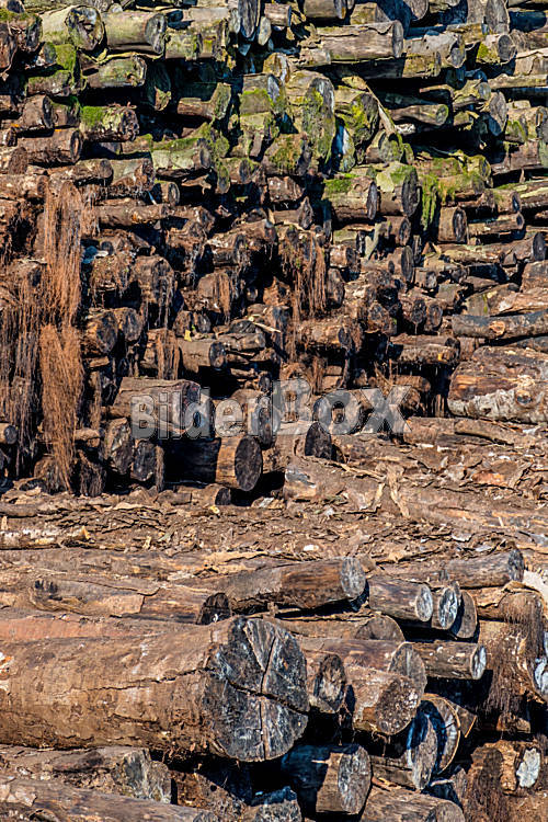 Beschreibung Stapel Holz mit Moos bewachsen, Symbol für Baustoff, Brennstoff, Vergänglichkeit, Tod