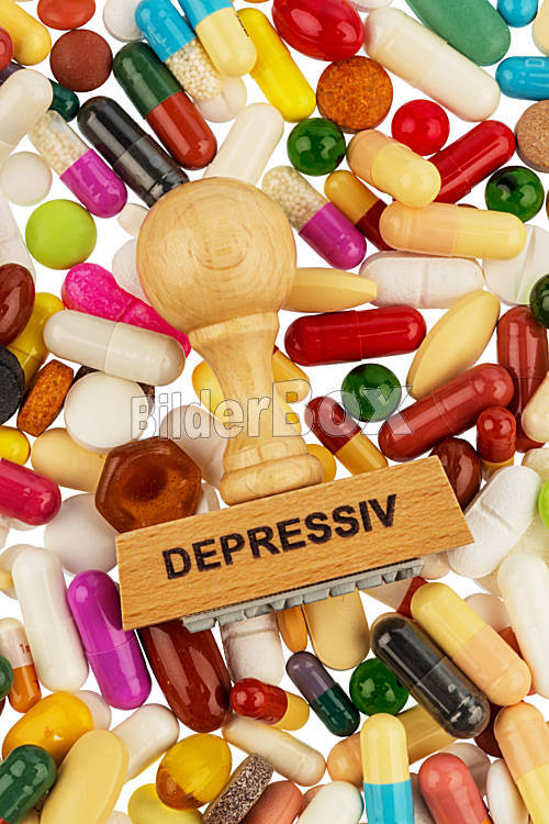 Beschreibung Stempel auf bunten Tabletten, Symbolfoto für Depressionen, Therapie und Psychopharmaka