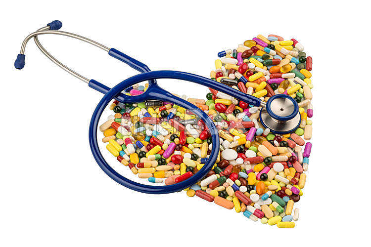 Beschreibung Stethoskop und Tabletten in herzförmiger Anordnung, Symbolfoto für Herzkrankheiten, Diagnostik und Medikation