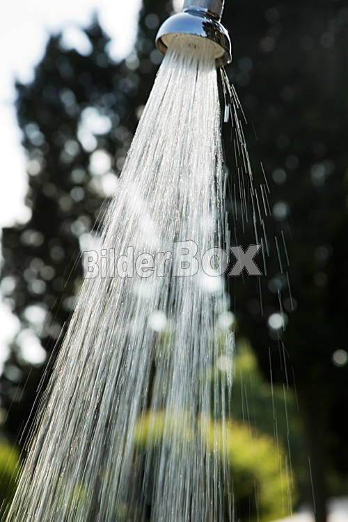 Beschreibung Der Wasserstrahl einer Dusche. Brause steht im Garten