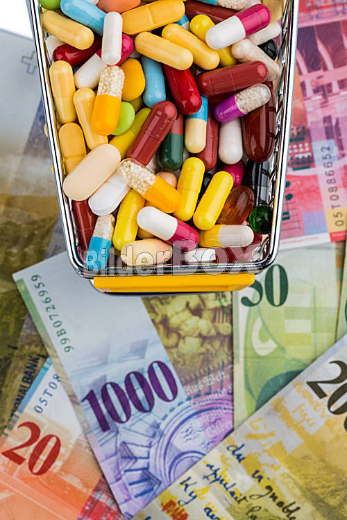Beschreibung Tabletten, Einkaufswagen, Schweizer Franken, Symbolfoto für Medikamente, Krankenkassen, Kosten im Gesundheitswesen
