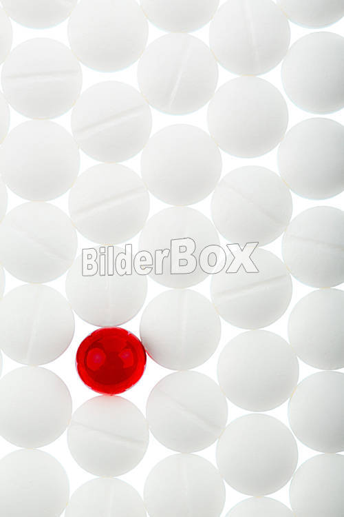 Beschreibung Weiße Tabletten im Kontrast mit einer roten Tablette, Symbolfoto für Mobbing und Individualität