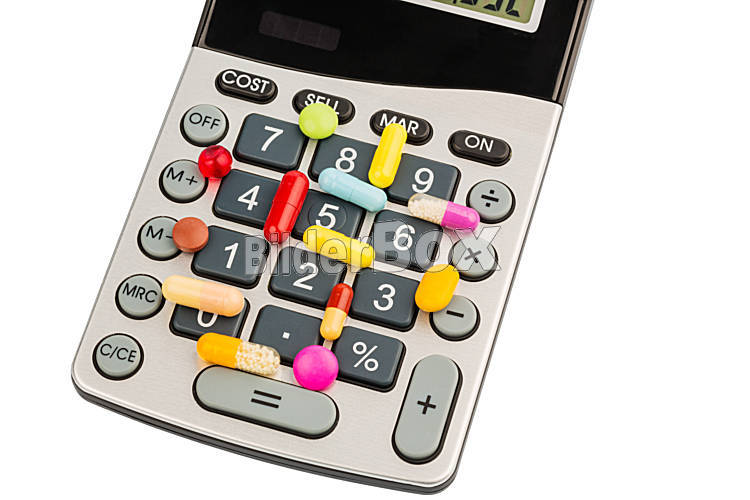 Beschreibung Tabletten liegen auf einem Taschenrechner. Symbolfoto für Kosten in der Medizin und Pharmaindustrie
