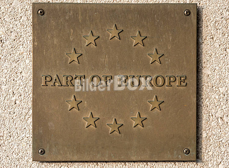 Beschreibung Tafel mit EU Logo auf einem Haus in Linz, Österreich