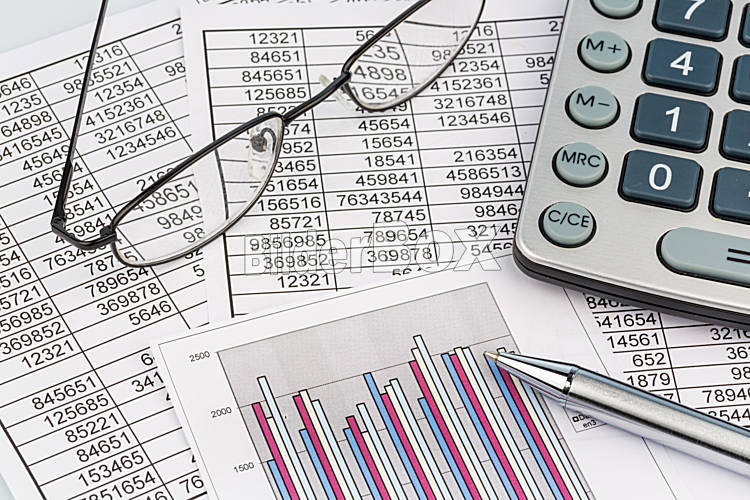 Beschreibung Ein Taschenrechner liegt auf den Zahlen einer Bilanz uns Statistik. Symbolphoto für Umsatz, Gewinn und Kosten.