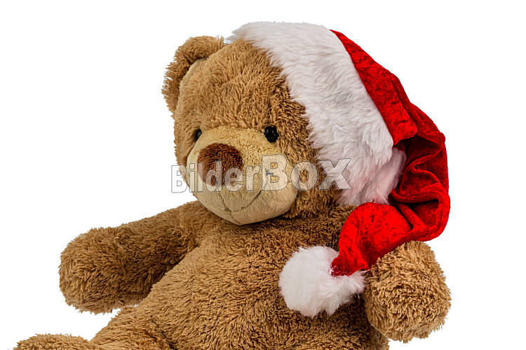 Beschreibung Ein Teddybär mit Geschenken zu Weihnachten. Als Weihnachtsmann verkleidet.