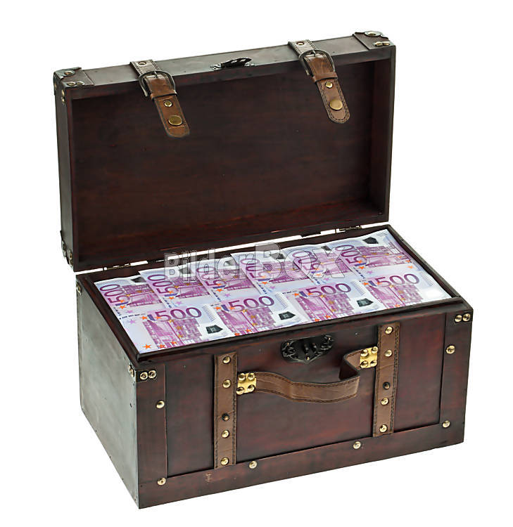 Beschreibung Eine große Truhe mit Euro Banknoten. Finanzkrise, Krise, Schulden.