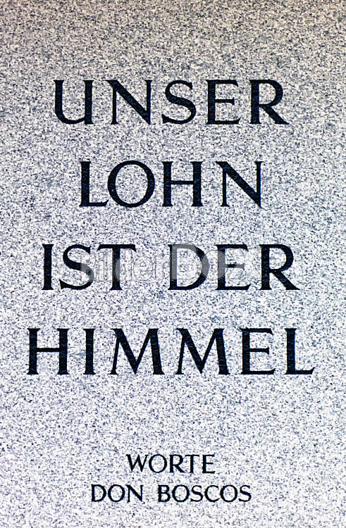 Beschreibung "Unser Lohn ist der Himmel". Sprichwort von Don Bosco auf einem Grabstein auf einem Friedhof