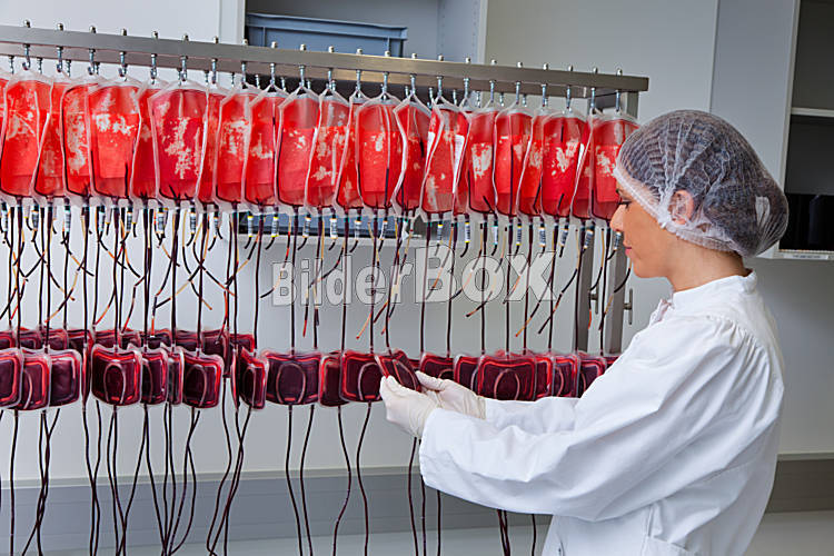 Beschreibung Eine Frau untersucht im Blutlabor die gespendeten Blutkonserven. Gesundheit und Vorsorge.