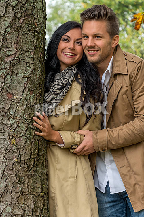 Beschreibung Ein junges, verlliebtes Paar schaut hinter einem Baum hervor