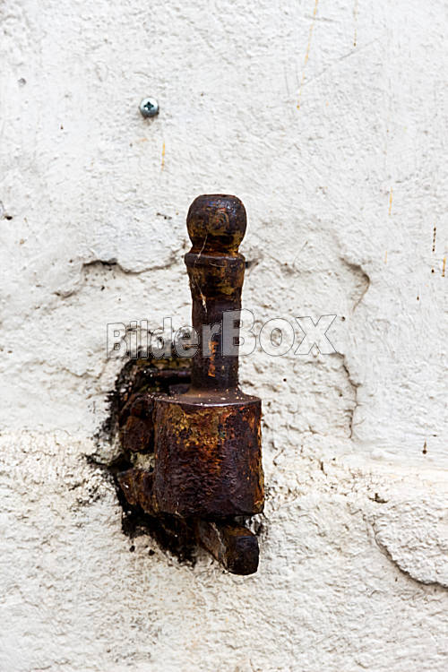 Beschreibung Verrostete Türangel aus Eisen, Symbol für Verfall, Vergänglichkeit, Altes Eisen