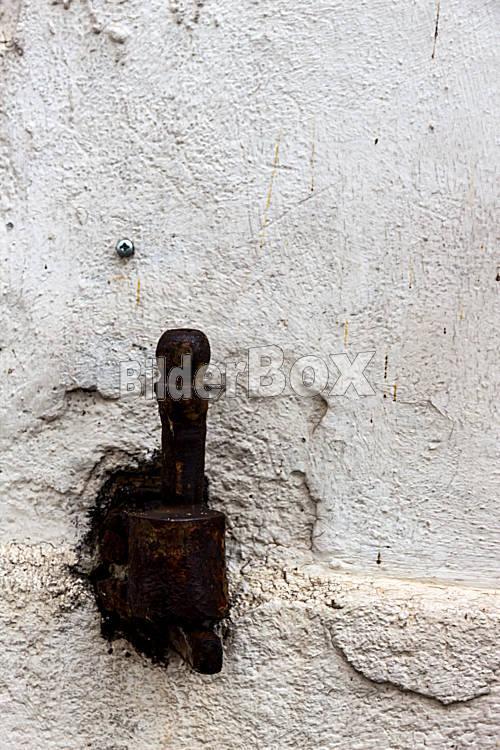 Beschreibung Verrostete Türangel aus Eisen, Symbol für Verfall, Vergänglichkeit, Altes Eisen