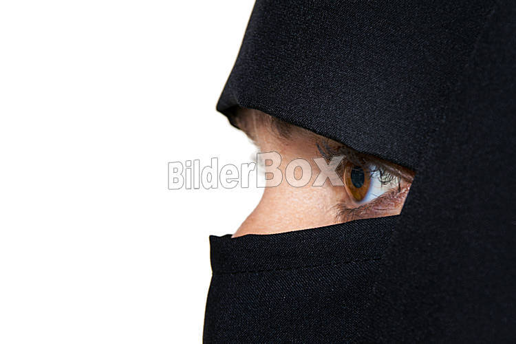 Beschreibung Symbolfoto Islam. Muslimische mit Burka ist verschleiert.