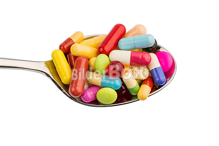 Beschreibung Viele bunte Tabletten auf einem Löffel. Symbolfoto für Tablettensucht und Mißbrauch von Medikamenten.