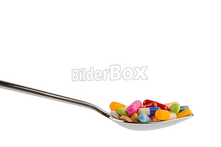 Beschreibung Viele bunte Tabletten auf einem Löffel. Symbolfoto für Tablettensucht und Mißbrauch von Medikamenten.