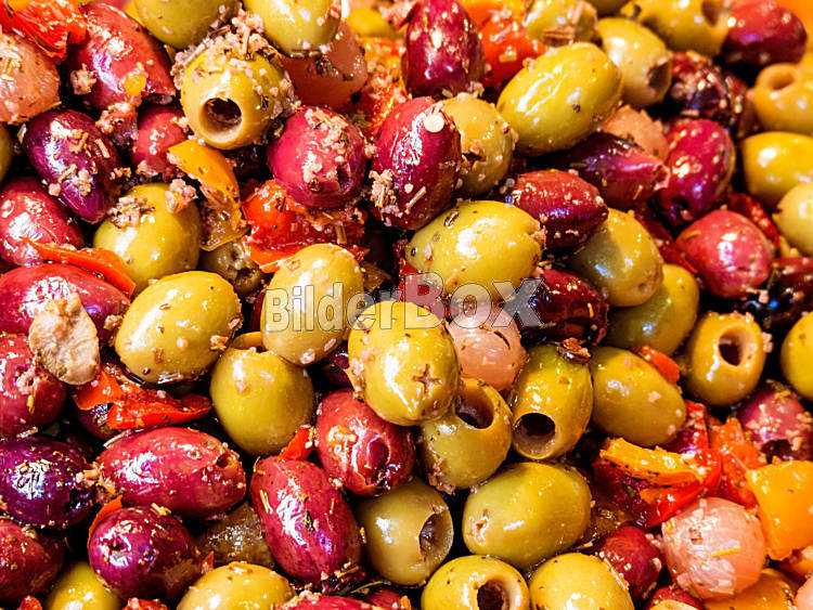 Beschreibung Vielfalt an Oliven, Symbolfoto für Lebensmittel, gesunde Ernährung, Frische